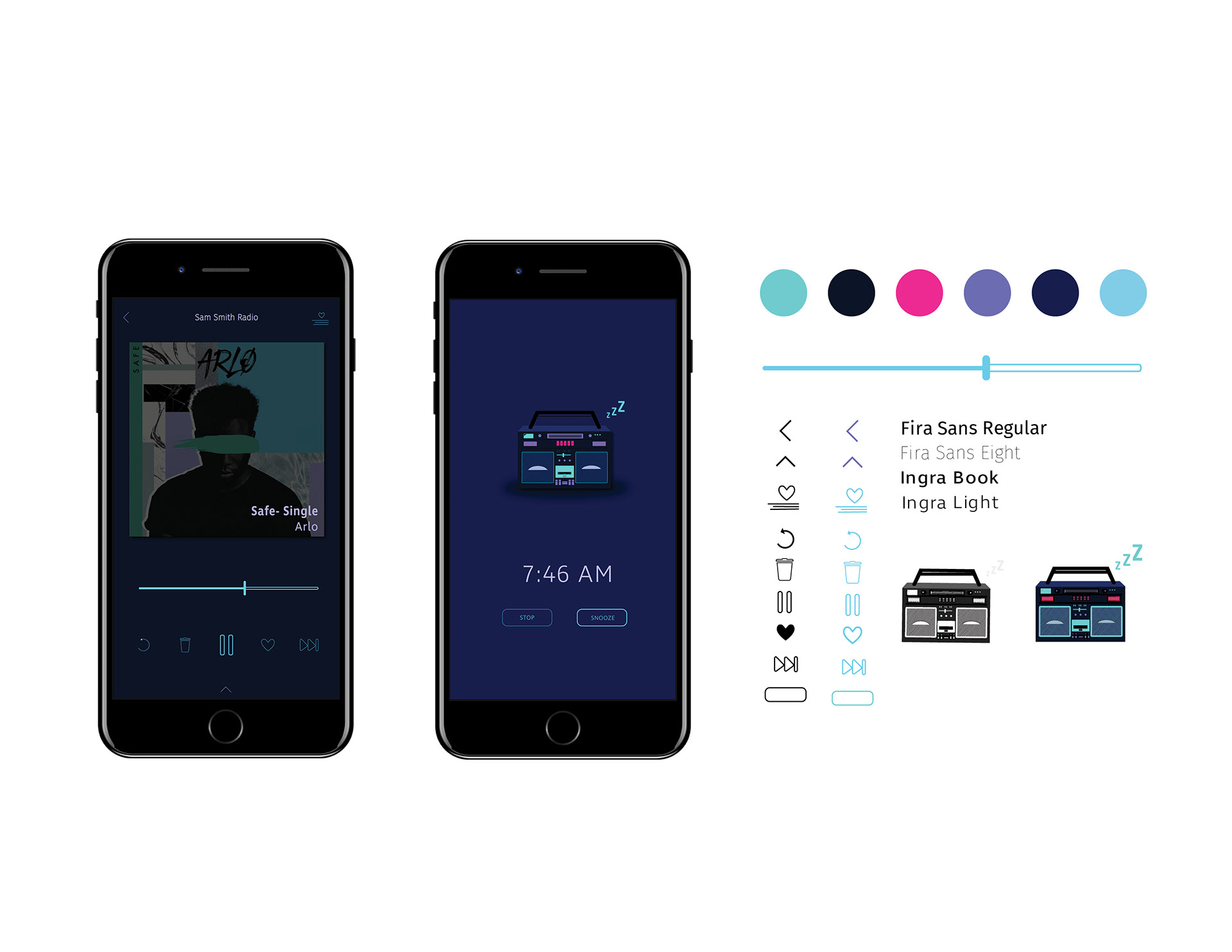 Goal: This is an exercise in visual design. I set out to define and develop multiple unique visual designs through the exploration and expression of a mobile audio player app redesign, providing several high level assets that are key to communicating the main design directions and UI of the project.